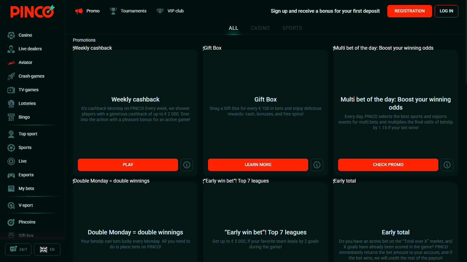 • Pinco казино сайтынын күнүмдүк бонустук сунушу – ар бир 24 саат сайын баштапкы төлөм стимулдары, акысыз айлануулар жана кэшбэк сыяктуу айланма сунуштар менен